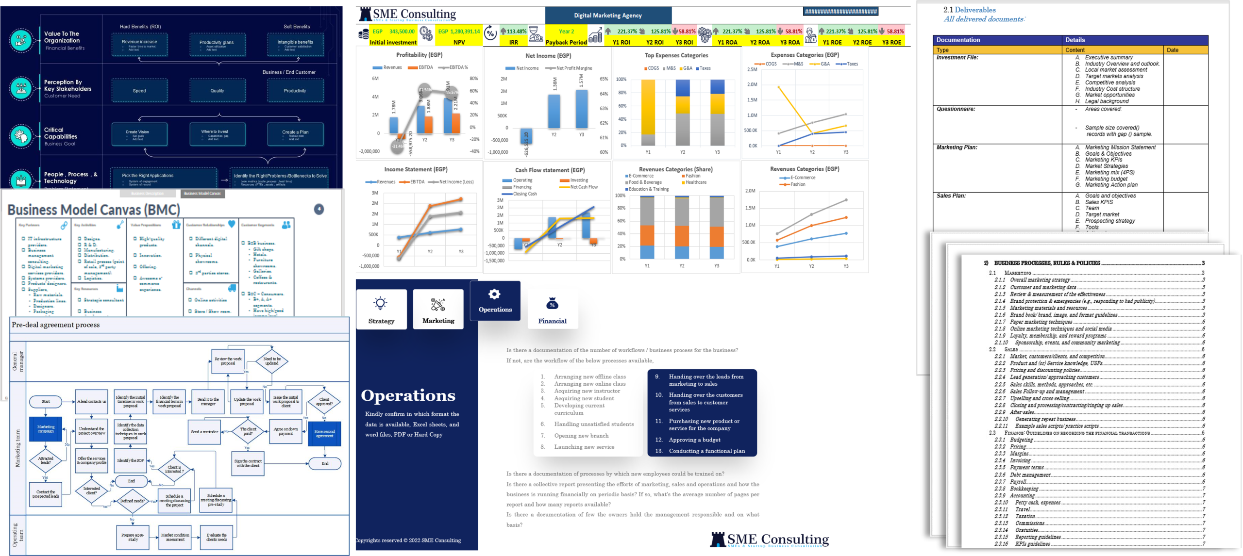 This is the core of your investment file, detailing a clear path to profitability and growth through a full business plan. We develop a robust strategy formulation, a detailed marketing plan, and a realistic sales plan. We also outline your operational plan, human resources management plan, and risk management plan. To prepare for all eventualities, we create expansion and exit scenarios.